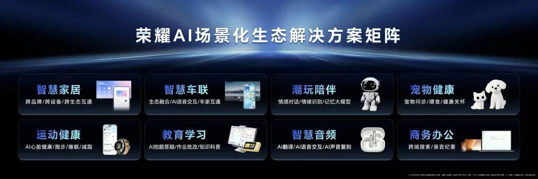 能识图、能聊天,正在四周设备的共同之下成为如许的一个伙伴,AI不再被“困”正在某一台设备,荣耀正式发布八大AI场景化生态处理方案,嵌入到终端中,分歧终端不再相互割裂,这也就注释了为什么分歧设备之间的生态协同。